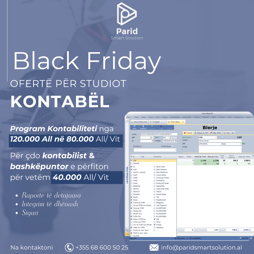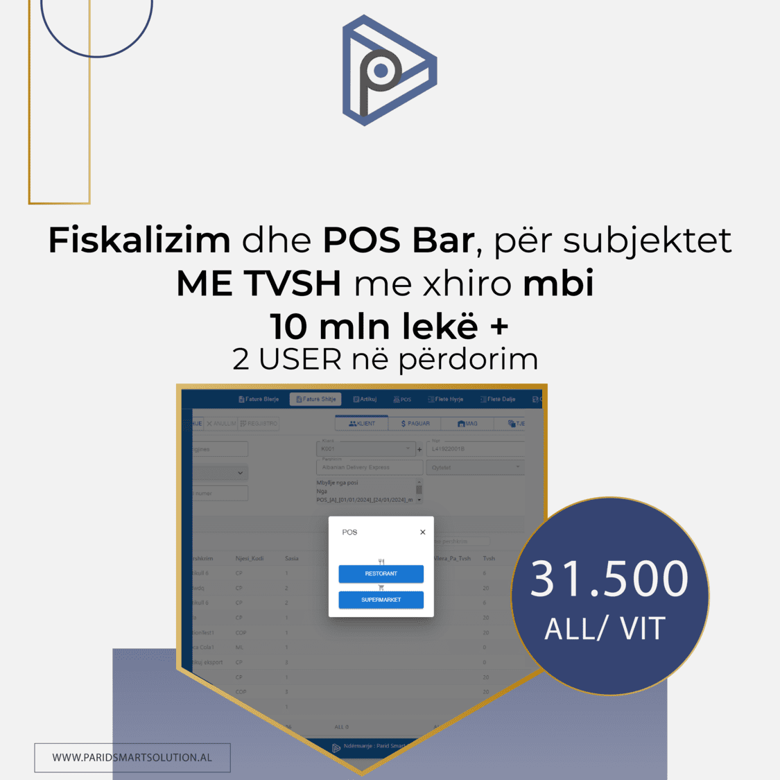 Parid Smart Solution ju prezanton më një program kontabiliteti manaxherial dhe fiskal në shërbim të çdo biznesi . Ky shërbim inovativ, lind nga kërkesat e shumta të klientëve tanë ndër vite. Me një staf me eksperiencë disa vjeçare në fushën e financës dhe kontabilitetit. Programi ynë do i vij në ndihmë secilit prej jush. Ofrojmë një program të kompletuar dhe shërbim profesional, me ekspertë financiarë të disponueshëm në çdo kohë. Dhe suport të dedikuar për Biznesin tuaj. Për tu informuar rreth paketave klikoni në butonin e mëposhtëm.
